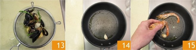 and transfer them into the strainer. Once they are all open, also pour the cooking liquid to filter it and collect it in the bowl 13, you will use it later. Place a pot on the stove, filled with water, salted to taste, which will be used for cooking the pasta. In the same pan, add a drizzle of oil and another clove of garlic 14. When hot, place the shrimp inside 15 and cook them on one side only for a couple of minutes over medium-high heat.