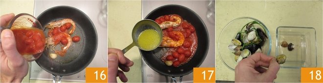 Then add the peeled tomatoes 16 and lower the heat so it doesn't splatter too much. Add a bit of the reserved bivalve cooking liquid 17 to thin it. Cook for about 5 minutes. Meanwhile, remove the empty halves of the mussels and clams 18, then also remove the garlic and parsley stems.