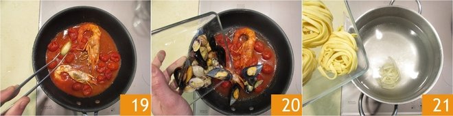 After 7 minutes, remove the garlic from the sauce 19 and add the mussels and clams 20. Let it flavor and turn off the heat. Then cook the scialatielli 21