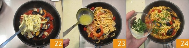 and 2-3 minutes before the cooking time is up, drain them and transfer them to the sauce 22. Turn the heat back on, add more bivalve cooking liquid 23 and finish cooking. Adjust with salt and pepper, then add a drizzle of oil and the chopped parsley. Mix the pasta well and serve it!