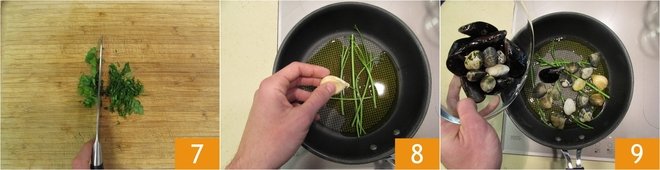 Finely chop the leaves 7. In a pan, pour a drizzle of oil, the parsley stems, and a clove of garlic 8. Let it flavor for a couple of minutes, raise the heat, and add the mussels and clams 9.