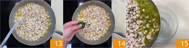 Add the shrimp 10 and sauté over high heat for 3-4 minutes. Deglaze with white wine 11, let it evaporate, then season with salt 12 and pepper.