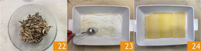 Transfer the mushrooms to a bowl and let them cool slightly 22. Now you can assemble the lasagna: spread some bechamel on the bottom of a baking dish 23, then place the first layer of pasta sheets 24.