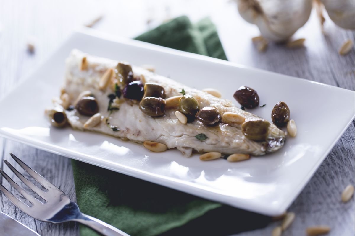 Ligurian sea bass is a traditional main course, easy and genuine, made with a symbolic ingredient of Liguria, the famous Taggiasca olives. These small yet flavorful olives are enough to add character to the dishes. The crunchy note of toasted pine nuts and the aromatic touch of fresh thyme leaves complete this simple but delicious dish. Come and discover how easy and quick it is to prepare our Ligurian-style sea bass, an excellent variant of the classic baked sea bass, and explore other delightful fish main courses: