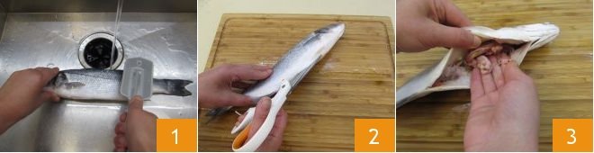 To prepare the Ligurian-style sea bass fillets, start by cleaning the fresh sea bass. Place the whole fish under running water and scale it using a fish scaler 1 or alternatively use the blade of a knife. You need to rub the scaler from the tail along the entire sea bass until it is completely scaled. Now place the fish on the cutting board and cut the belly open with scissors 2. Remove the insides 3.