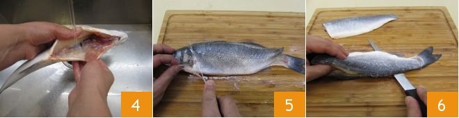 Then rinse the fish under running water to remove any residues 4. Now fillet the fish: remove the head 5 and then, keeping the knife parallel to the work surface, make a deep cut along the backbone of the sea bass, close to the bones, making it easier to separate the fillet 6.