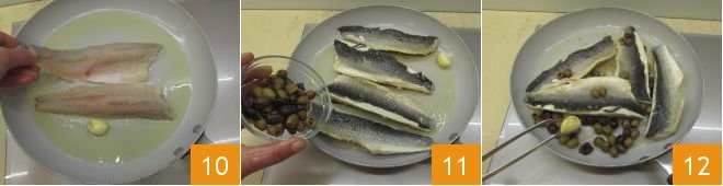 let it infuse well, and place the sea bass fillets in the pan, skin side down 10. Cook for 2 minutes over medium heat, being careful to turn them with a spatula halfway through cooking. Do this very gently so as not to break the sea bass. At this point, add the olives 11, and use kitchen tongs to remove the garlic 12.