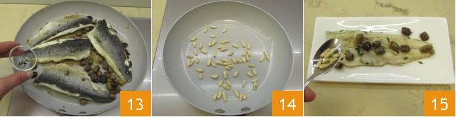 Salt, pepper, and season the sea bass fillets with fresh thyme leaves 13. Turn off the heat and, in another pan, toast the pine nuts for 2-3 minutes over medium heat 14. Serve the Ligurian-style sea bass fillet with olives and garnish with the toasted pine nuts 15!