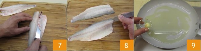 With a small knife, remove the reddish veins located in the central part of each fillet 7. Now gently remove the noticeable bones from the fish's belly with a knife, being careful not to break the flesh. Proceed by removing the remaining bones with tweezers 8. Now place a pan on the heat with oil and a clove of garlic 9,