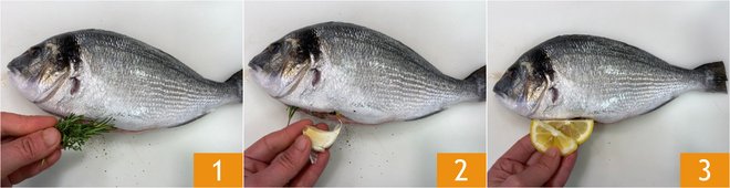 To prepare the sea bream in the microwave, start with the cleaning of the sea bream. Use scissors to cut off the fins, then descale under running water using the back of the knife or a special tool. Make a cut on the belly of the fish up to the head. Remove the innards and rinse well under water to remove all impurities. Fill the cavity with thyme, rosemary 1, garlic 2, and lemon 3.