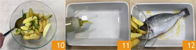 Mix 10. Pour a drizzle of oil into a baking dish 11, place the sea bream on top and add the potatoes 12.