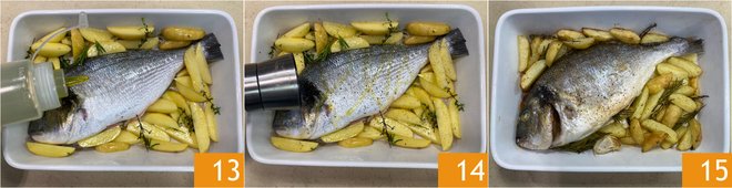 Season with a drizzle of oil 13, salt, and pepper 14 and cook in the microwave at 650 W for 20 minutes, then continue cooking in grill mode for another 6 minutes. The sea bream in the microwave is ready to be served 15.