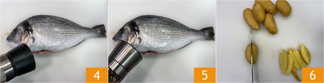 Season with salt 4 and pepper 5. Now focus on the new potatoes. Wash them well and, without peeling, cut each into 4 wedges 6.