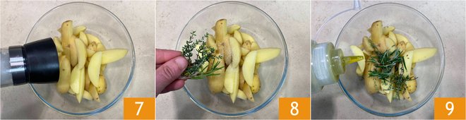 Transfer them into a bowl and season with salt 7, thyme, and rosemary 8. Add a drizzle of oil 9.