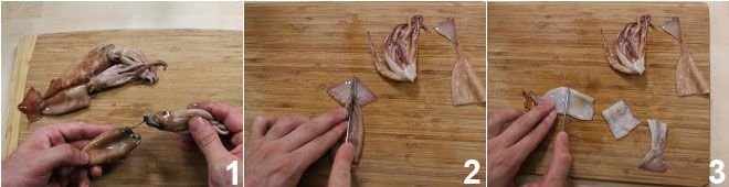 To prepare the sea skewers, start by cleaning the small squid: remove the tentacles and set them aside 1, empty the sac of the innards and clean it well. Open the sac of the small squid with a central cut 2 and cut it into rectangular pieces 3.