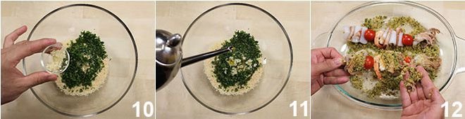 Prepare the breading: in a bowl, mix the breadcrumbs with the parsley and the garlic 11, sprinkle with pepper, and add a drizzle of oil 11. Roll the skewers in the breading on both sides 12.
