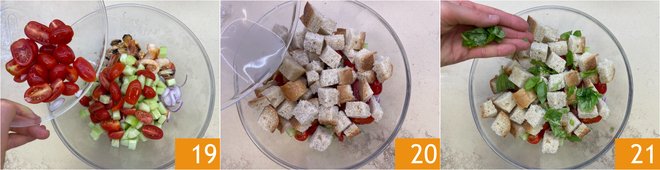 Finally, cut the bread into cubes about 1 1/4 inch 16. You are ready to assemble the dish: in the bowl with shrimp and squid, add the mussels 17, the onion, and the cucumbers 18.