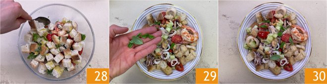 Mix well to combine all the ingredients 28. Plate and finish with a few basil leaves 29. Your seafood panzanella is ready to be served 30!
