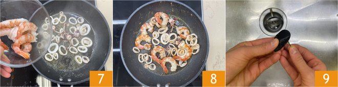 Proceed with How to clean shrimp: remove the head 4, then peel off the shell 5 and the intestine located on the shrimp's back. Heat a drizzle of oil in a pan, then add the squid 6 and cook on high heat for 3 minutes.