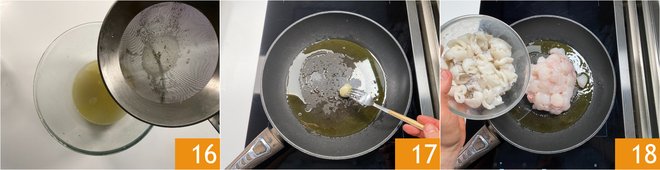 Strain the liquid through a sieve and set aside 16. In a pan, heat a swirl of oil with the other garlic clove 17, add the monkfish chunks and cuttlefish 18.