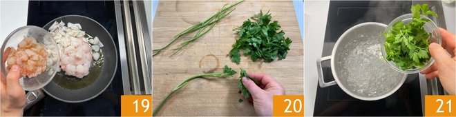 Also add the shrimp 19 and let them sizzle over high heat for a couple of minutes, shaking the pan well, until the cooking base is dry. At this point, all the seafood will be cooked. Prepare the parsley oil: separate the parsley leaves from the stems 20 and boil them for 1 minute in boiling water 21.