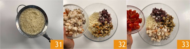 Drain the rice 31 and let it cool. At this point, pour the rice into a large bowl, add the fish and seafood 32, then also add the cherry tomatoes 33.
