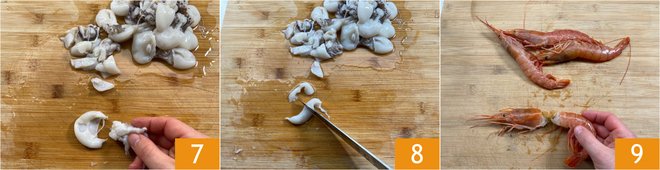 Then take care of the How to clean cuttlefish by removing the insides 7, then cut the mantle into 1.5 cm (0.6 inches) chunks after separating it from the tentacles 8. Clean the shrimp by removing the head 9, shell, and tail.