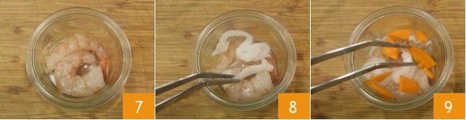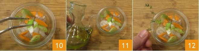 At this point, you can assemble your jars (choose new jars suitable for jar cooking with airtight seals and rubber gaskets): place the shrimp at the bottom 7, then add the baby squid 8, the carrots 9,