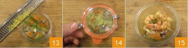 and grated lemon zest 13. Close the jar tightly 14 and cook in the microwave at a power of 450W for 3 minutes. Once ready, let it cool for a couple of minutes before opening: to open the jar, keep the lid, release the locks, and pull the rubber tab; serve your seafood salad in jar cooking 15!