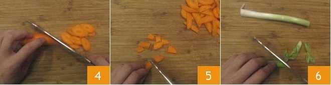 Now peel the carrot and slice it thinly on the diagonal 4, then cut each slice into 4 parts 5. Finally, clean the spring onion and slice it into thin rings, always on the diagonal 6.