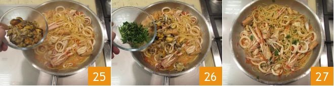 lastly, add the shelled mussels and clams 25. At the end of cooking, turn off the heat, season with a chopped sprig of parsley and toss one last time. Serve seafood spaghetti very hot 27.