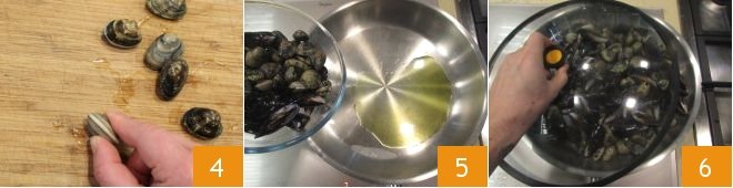 It may happen that the shell of some clams contains only sand, to be sure that this is not the case, tap the shell on a chopping board decisively but not too hard, making sure that the opening is downwards. If you notice a black spot on the chopping board it means that it's full of sand and should therefore be discarded 4, but test also with a knife to see if it actually contains sand. Heat 2 tablespoons of olive oil in a large saucepan and when it is hot, pour in the clams and mussels 5, cover immediately with a lid and wait until they are all completely open, about 3-4 minutes 6.