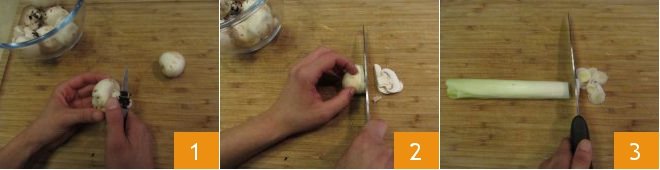 To prepare the baked sedanini casserole, start with the How to Clean Porcini Mushrooms. After removing the earthy base 1, clean the surface with a damp cloth. Slice them 2 and set them aside. Then clean the leek by removing the two outer leaves and trimming it, then cut it into thin rings 3.