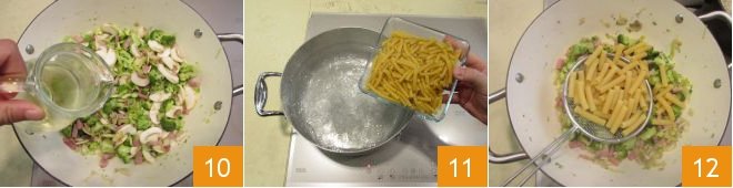 Once the base is well browned, season with salt without overdoing it, deglaze with white wine 10 and let the alcohol evaporate before lowering the heat and continue cooking for another 10 minutes. In the meantime, add the pasta to boiling salted water 11, and as soon as it is al dente, drain it directly into the pan 12.