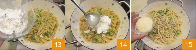 Add the ricotta 13, a ladle of pasta cooking water, and stir 14. After adjusting the consistency, you can turn off the stove and add the grated caciocavallo cheese 15