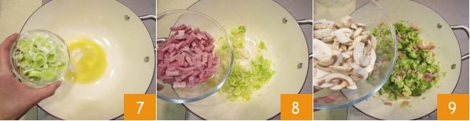 In a casserole suitable for the oven, heat a drizzle of oil and add the leek 7 and ham 8. Let them sauté for a few moments before adding the broccoli and mushrooms 9.