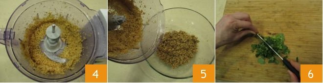 and blend them until a puree is obtained 4. Then add it to the seitan mixture 5 in a large bowl. Wash and chop the coriander 6