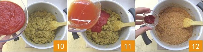 add the tomato puree 10, rinsing the bowl with a little water to collect all the puree and make the ragout a little more moist 11. Mix well and also add the tomato paste 12.