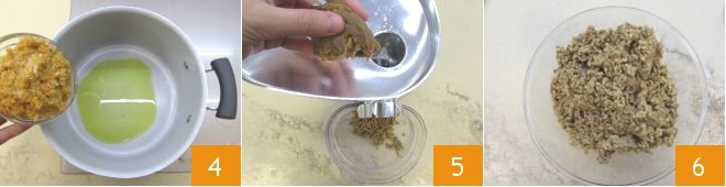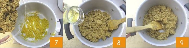 Heat the oil in a large pot and add the minced vegetables 4. Let them brown over low heat for at least 15 minutes, until the sauté is dry. Meanwhile, focus on the seitan. Insert it a little at a time into a meat grinder 5 to obtain a mince 6. If you don't have a meat grinder, you can chop the seitan with a knife.