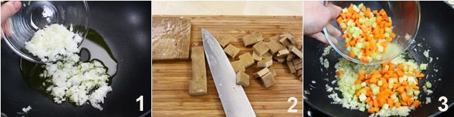 In a saucepan, place the oil and onion, and let it soften 1; in the meantime, cut the seitan into cubes 2 and when the onion has softened, add the celery and carrot, and let them braise as well 3.