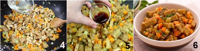 Add the seitan to the saucepan with the vegetables and then deglaze with white wine 4; finally, add a tablespoon of soy sauce 5, then season with salt if necessary and add the chopped parsley 6.