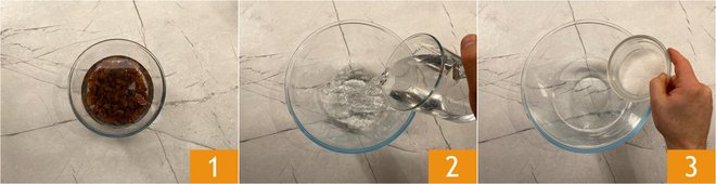 To prepare Sicilian sfinci, start by soaking the raisins 1. Meanwhile, pour the room temperature water into another bowl 2 and add the sugar 3.