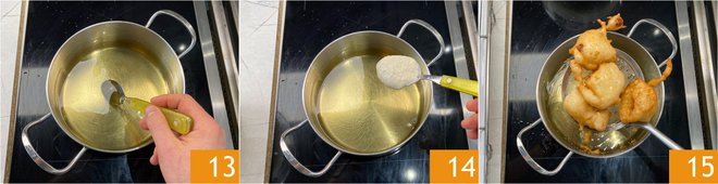 Heat plenty of seed oil in a pan to 340°F 13, then take a spoonful of dough and immerse it in the hot oil 14. Fry for about 3-4 minutes, occasionally turning the sfinci with a slotted spoon. Drain when they are nicely puffed and golden 15.