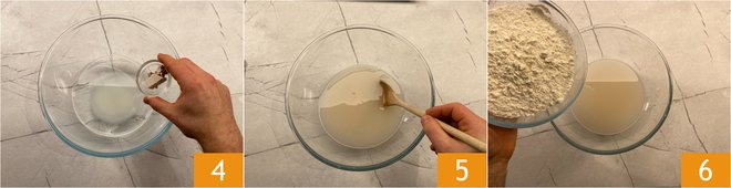 Add the crumbled yeast 4 and stir until it is completely dissolved 5. At this point, add the flour 6.