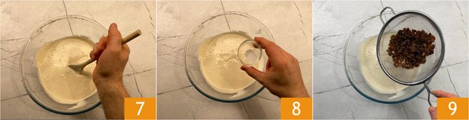 Work energetically for 5 minutes to dissolve any lumps 7. Add the salt 8 and then the drained raisins 9.