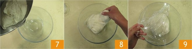 Transfer the dough to a bowl and give it its first fold: imagine dividing the dough into 4 parts, lift one edge of the dough at a time 8 and bring it towards the center, rotating the bowl will make it easier 9.