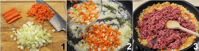 To prepare the shepherd's pie, start by chopping the onion and cutting the celery and carrots into small cubes 1. Melt the butter in a pan and add the oil, onion, carrots, and celery, sauté for a few minutes 2. Then add the minced lamb and let it brown well, breaking it up with a wooden spoon 3.