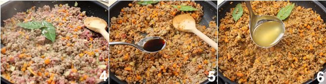 Add the bay leaf and thyme leaves 4. Then incorporate the tomato paste, mix and add the Worcestershire sauce 5 and the broth 6. Bring to a boil and let it simmer over low heat for about 45 minutes, until you get the consistency of a thick sauce (similar to ragù).