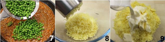 Add the frozen peas 7, adjust with salt and pepper, and cook until the peas are tender. While the sauce cooks, prepare the mashed potatoes for the topping: cook the potatoes with the skin in salted water until they are tender (about 30 minutes). Peel them and pass them through a food mill while still warm 8. Add the warm milk, room temperature butter 9,