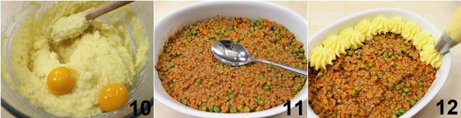 egg yolks 10, salt, pepper, and nutmeg, and mix the ingredients well. At this point, place the meat and pea sauce in an ovenproof dish and level it with a spoon 11. Then put the mashed potatoes in a piping bag with a star nozzle and create potato dollops on top of the meat 12, forming a layer of potatoes. Bake the shepherd's pie for 30 minutes at 392°F (200°C). In the last 10 minutes, turn on the oven grill to create a golden crust on the potatoes. Remove the pie from the oven and let it rest for about ten minutes before serving!
